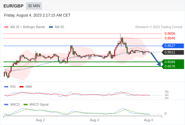 欧元/英镑 当日内: 看跌,在 0.8627 之下。