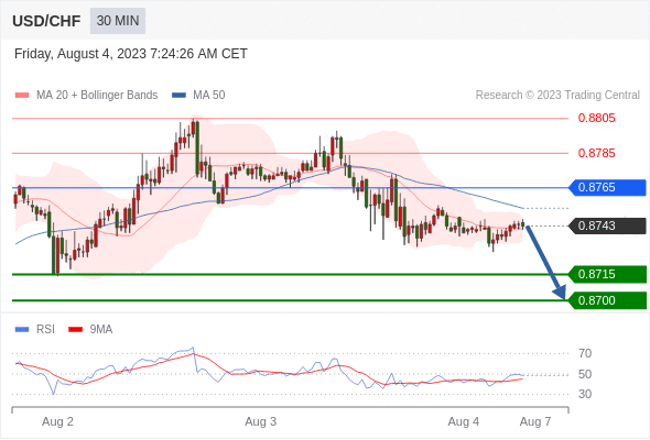 美元/瑞郎 当日内: 短期关键阻力位在0.8765。