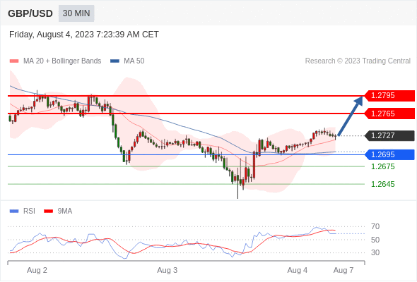 在 1.2695 之上,看涨,目标价位为 1.2765 ,然后为 1.2795 。