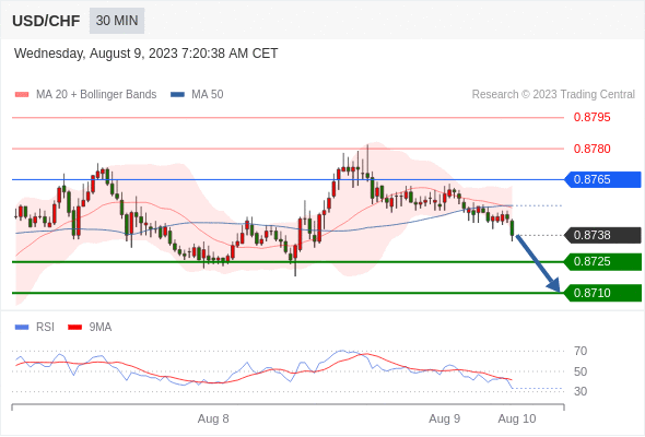 在 0.8765 之下,看跌,目标价位为 0.8725 ,然后为 0.8710 。