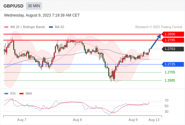 在 1.2725 之上,看涨,目标价位为 1.2785 ,然后为 1.2800 。