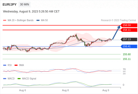 欧元/日元 当日内: 看涨,当 156.41 为支撑位。