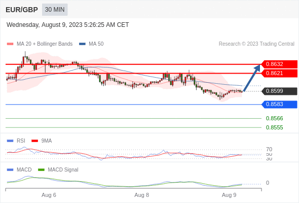 欧元/英镑 当日内: 有上涨的可能,目标价位定在 0.8632 。