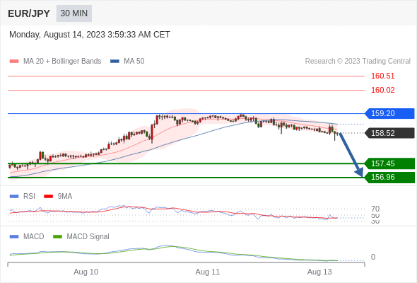 欧元/日元 当日内: 看跌,在 159.20 之下。