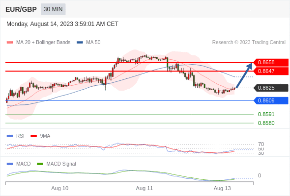欧元/英镑 当日内: 有上涨的可能,目标价位定在 0.8658 。