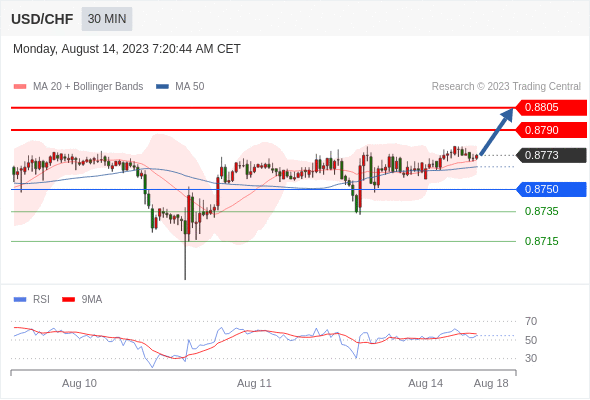 在 0.8750 之上,看涨,目标价位为 0.8790 ,然后为 0.8805 。