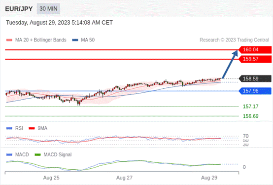 如跌破 157.96 ,EUR/JPY 目标方向定在 157.17 和 156.69 。