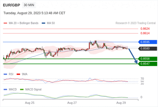 RSI技术指标小于中性区域50。 MACD技术指标呈现看跌状态并 处在其信号线的下方。 此外,价位处在其20天及50天移动平均线下方 ( 当前是 0.8582 和 0.8584 )。