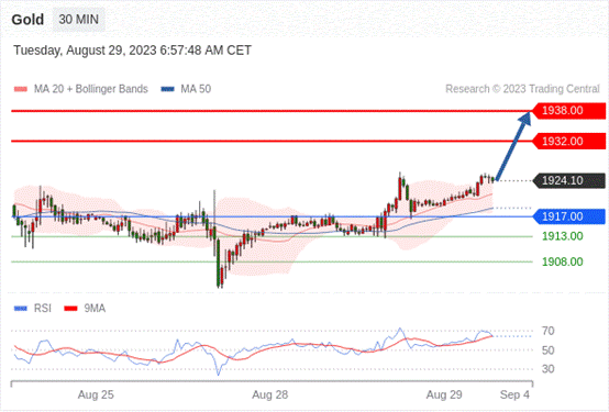 在 1917.00 之上,看涨,目标价位为 1932.00 ,然后为 1938.00 。
