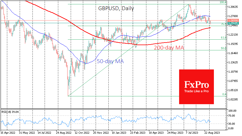 然而,市场似乎更关注经济收缩而非”优于预期的数据”。英镑兑美元日内一度跌至1.2530的低点,随后在纽约市场交易活跃时回升至1.2570。自7月中旬以来,该货币对已经下跌了4.5%左右,并出现了连续的低点和高点。该货币对可能在1.2410-1.2470区域找到实际的支撑,下界是200日平均线,上界是去年9月至今年7月整个反弹期间76.4%的斐波那契水平。