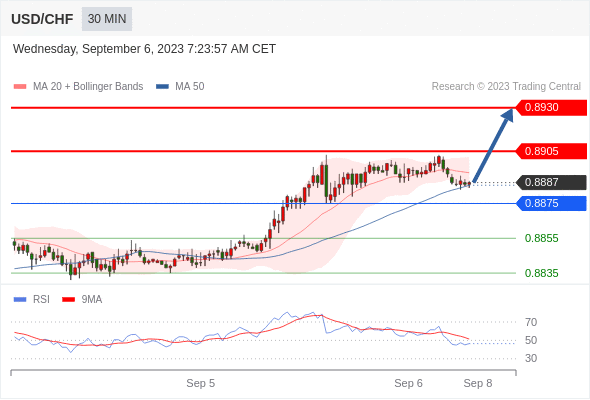 在 0.8875 之上,看涨,目标价位为 0.8905 ,然后为 0.8930 。