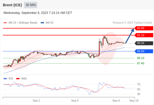 布伦特原油 (ICE)? (X3)? 当日内: 目标位为92.00。