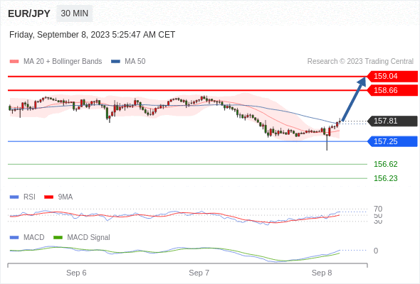 欧元/日元 当日内: 看涨,当 157.25 为支撑位。