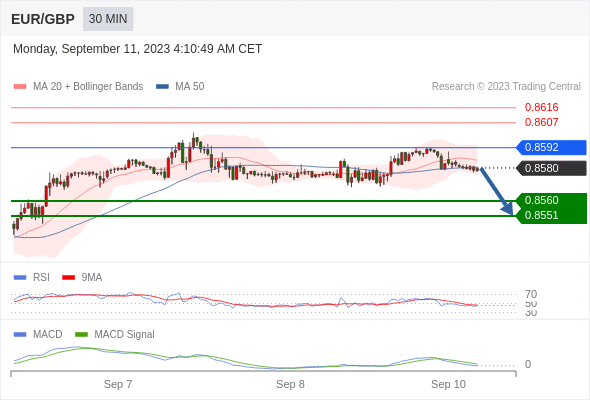 RSI技术指标小于中性区域50。 MACD技术指标呈现看跌状态并 处在其信号线的上方。 此外,价位处在其20天及50天移动平均线下方 ( 当前是 0.8576 和 0.8581 )。