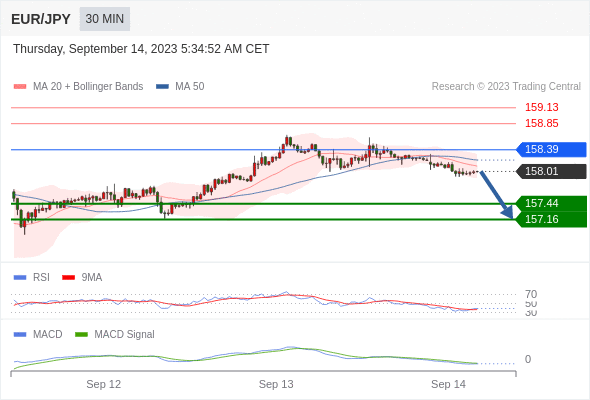 欧元/日元 当日内: 看跌,在 158.39 之下。