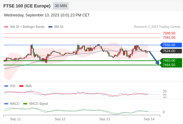英国富时100指数期货 当日内: 逐渐下跌,当 7550.00 阻碍上行,则 7464.50 为目标位。