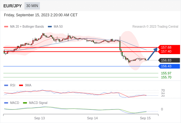 欧元/日元 当日内: 有上涨的可能,目标价位定在 157.68 。
