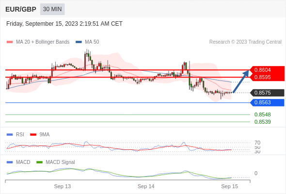 RSI技术指标低于50。 MACD技术指标呈现看跌状态并 处在其信号线的上方。 此外,价位低于其20天及50天移动平均线 ( 分别位于 0.8578 和 0.8589 )。