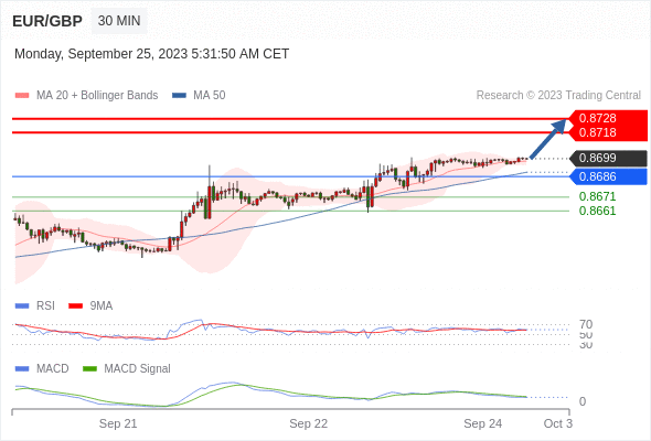 欧元/英镑 当日内: 看涨,当 0.8686 为支撑位,目标定在0.8728。