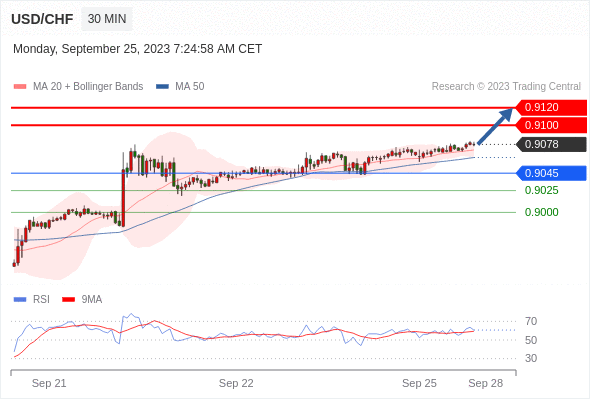 在 0.9045 之上,看涨,目标价位为 0.9100 ,然后为 0.9120 。