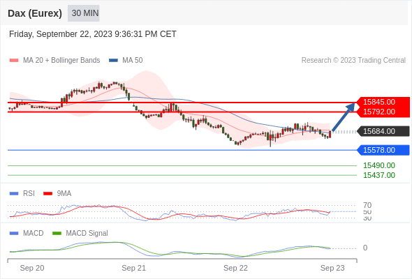 德国DAX指数期货 (Eurex)? 当日内: 调整至 15578.00 处,在反弹上升之前。