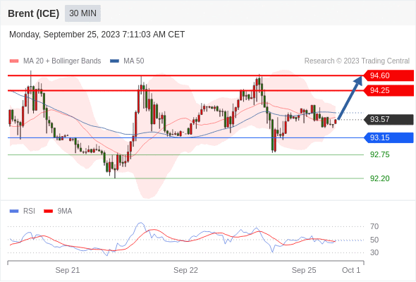 布伦特原油 (ICE)? (X3)? 当日内: 目标位为94.60。