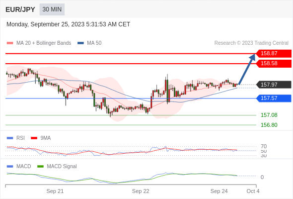 欧元/日元 当日内: 看涨,当 157.57 为支撑位,目标定在158.87。