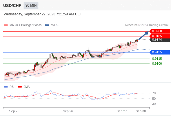 在 0.9135 之上,看涨,目标价位为 0.9185 ,然后为 0.9200 。