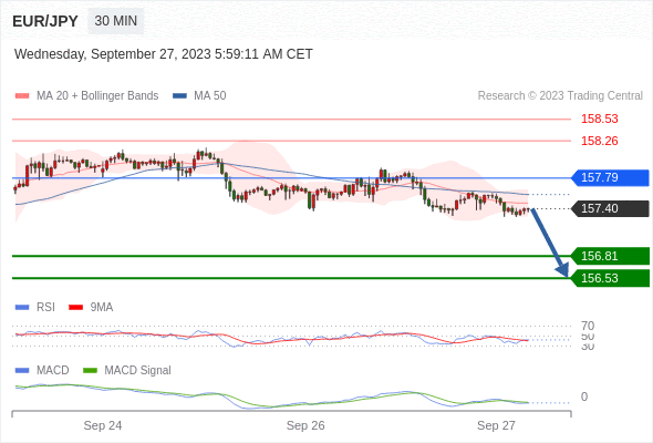 欧元/日元 当日内: 看跌,在 157.79 之下。