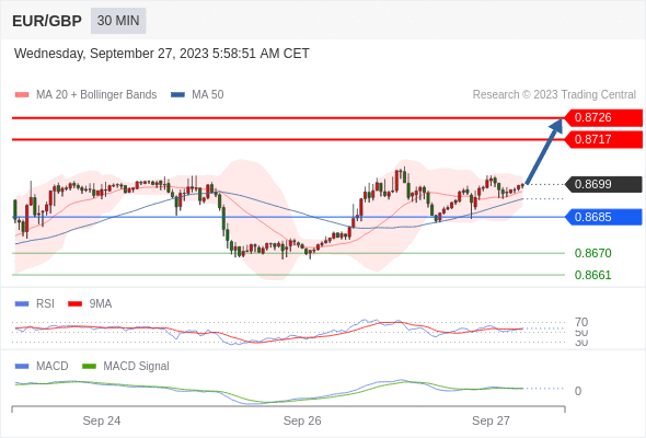 欧元/英镑 当日内: 看涨,当 0.8685 为支撑位,目标定在0.8726。