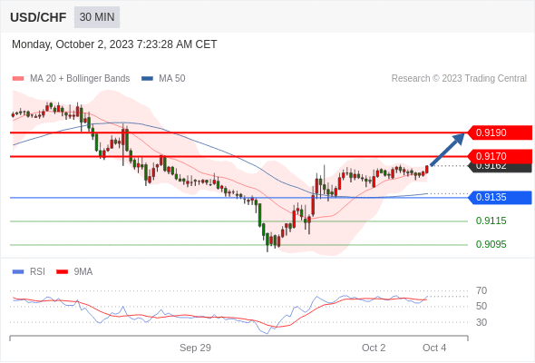 在 0.9135 之上,看涨,目标价位为 0.9170 ,然后为 0.9190 。