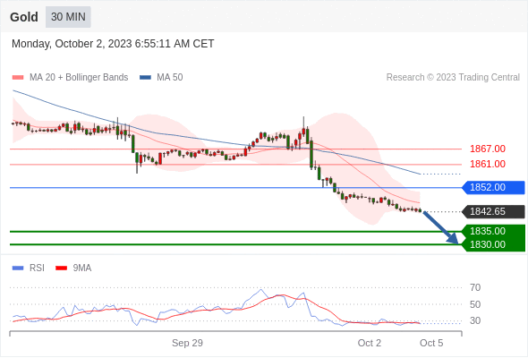 在 1852.00 之下,看跌,目标价位为 1835.00 ,然后为 1830.00 。