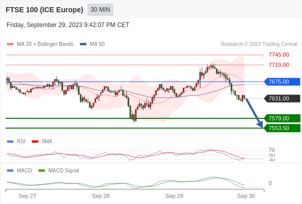 英国富时100指数期货 当日内: 看跌,在 7675.00 之下。