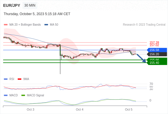 欧元/日元 当日内: 看跌,在 156.58 之下。