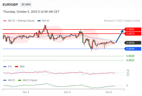 欧元/英镑 当日内: 有上涨的可能,目标价位定在 0.8681 。