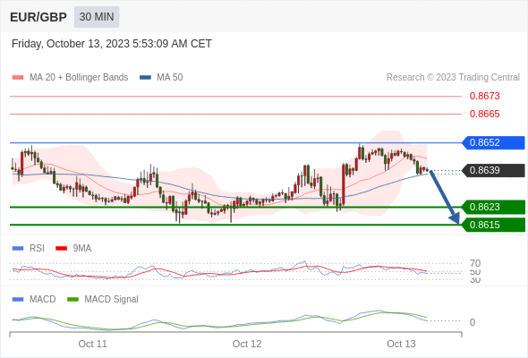 欧元/英镑 当日内: 逐渐下跌,当 0.8652 阻碍上行,则 0.8615 为目标位。