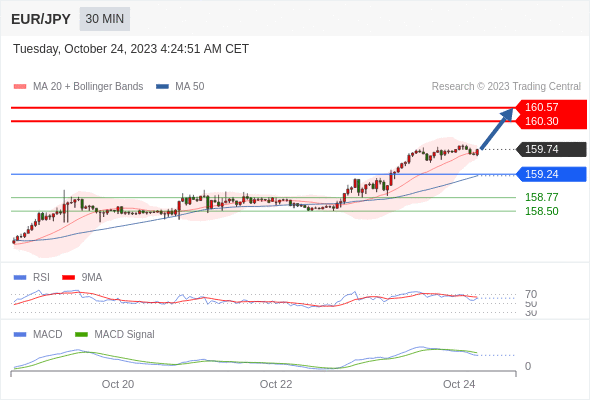欧元/日元 当日内: 看涨,当 159.24 为支撑位,目标定在160.57。