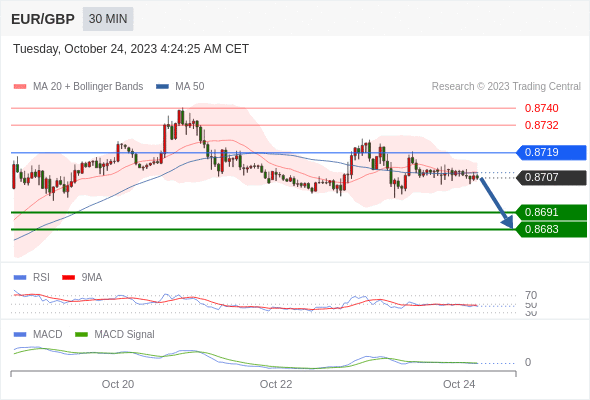 欧元/英镑 当日内: 看跌,在 0.8719 之下。
