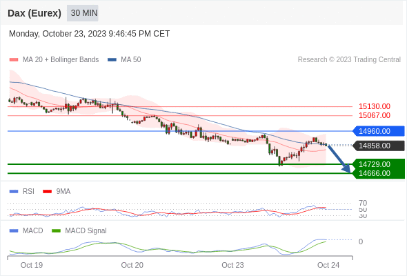 德国DAX指数期货 (Eurex)? 当日内: 在进一步下跌之前,反弹至 14960.00 附近。