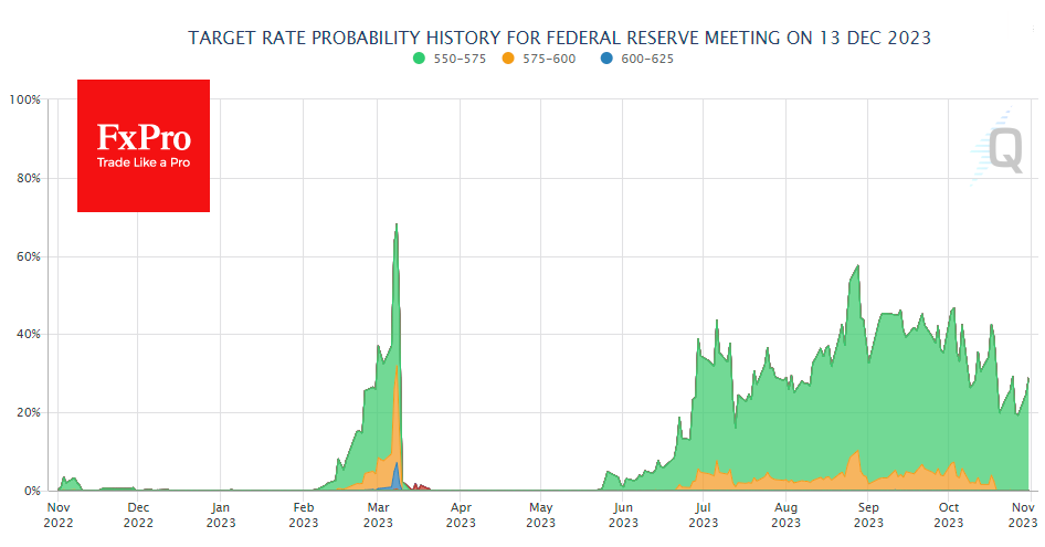 FxPro高级分析师Alex Kuptsikevich指出:市场走势的所有疑虑和潜在走向都集中在对未来道路的情绪上。最新数据显示,市场预计美联储12月加息的概率为29%,而最近这一概率低至20%。