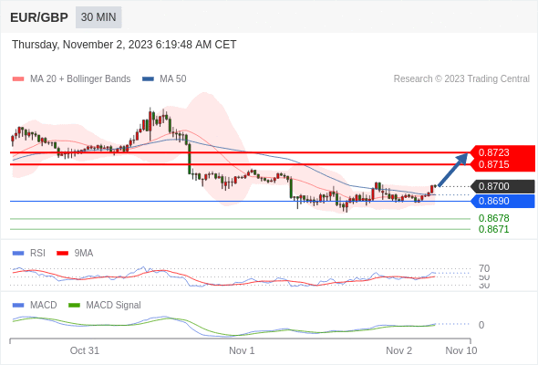 欧元/英镑 当日内: 看涨,当 0.8690 为支撑位。