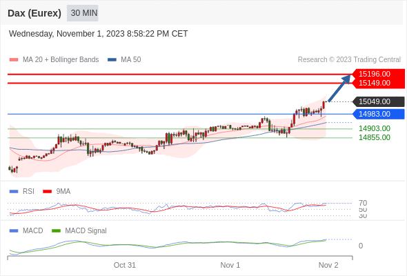 RSI技术指标大于中性区域50。 MACD技术指标处在其信号线之上 看多。 此外,价位处在其20个时期及50个时期移动平均线上方 ( 当前是 14972.65 和 14937.08 )。