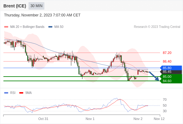 布伦特原油 (ICE)? (F4)? 当日内: 短期关键阻力位在85.80。