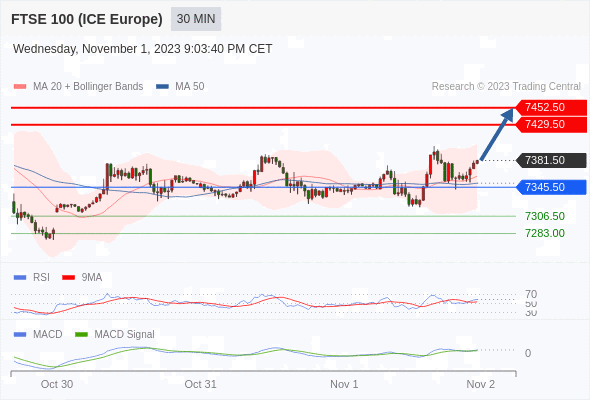 如跌破 7345.50 ,英国富时100指数期货 目标方向定在 7306.50 和 7283 。