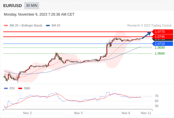 在 1.0710 之上,看涨,目标价位为 1.0745 ,然后为 1.0770 。