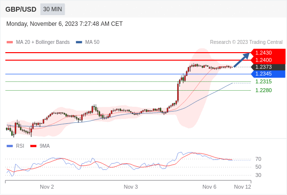 英镑/美元 当日内: 在1.2345之上,看涨。
