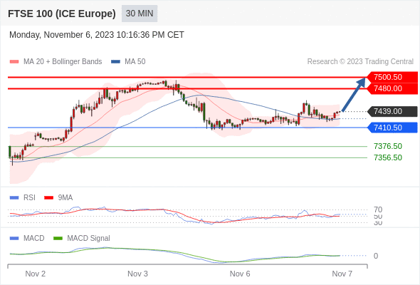 如跌破 7410.50 ,英国富时100指数期货 目标方向定在 7376.50 和 7356.50 。