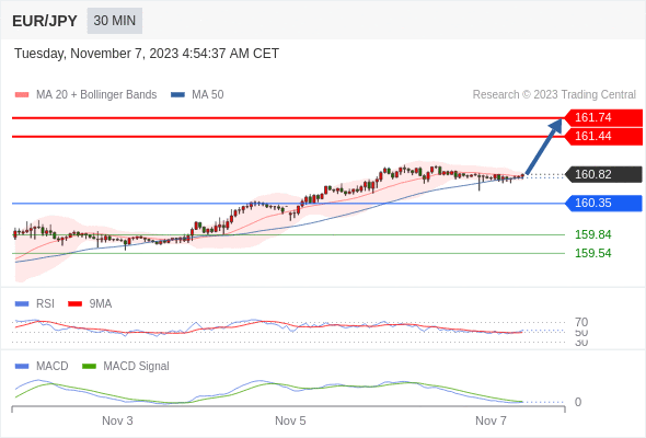 欧元/日元 当日内: 看涨,当 160.35 为支撑位,目标定在161.74。
