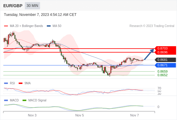 欧元/英镑 当日内: 看涨,当 0.8671 为支撑位,目标定在0.8703。