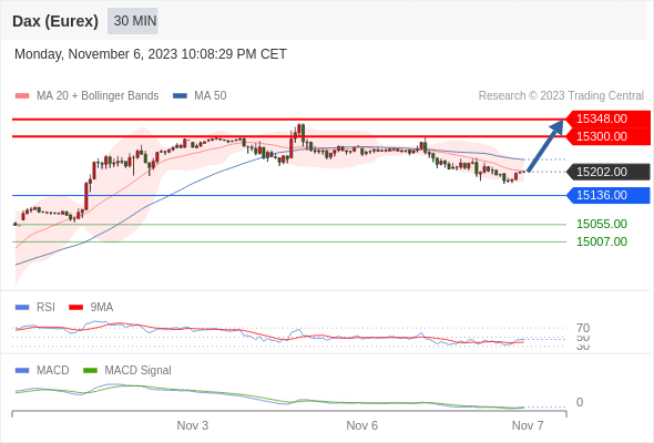 如跌破 15136 ,德国DAX指数期货 (Eurex) 目标方向定在 15055 和 15007 。
